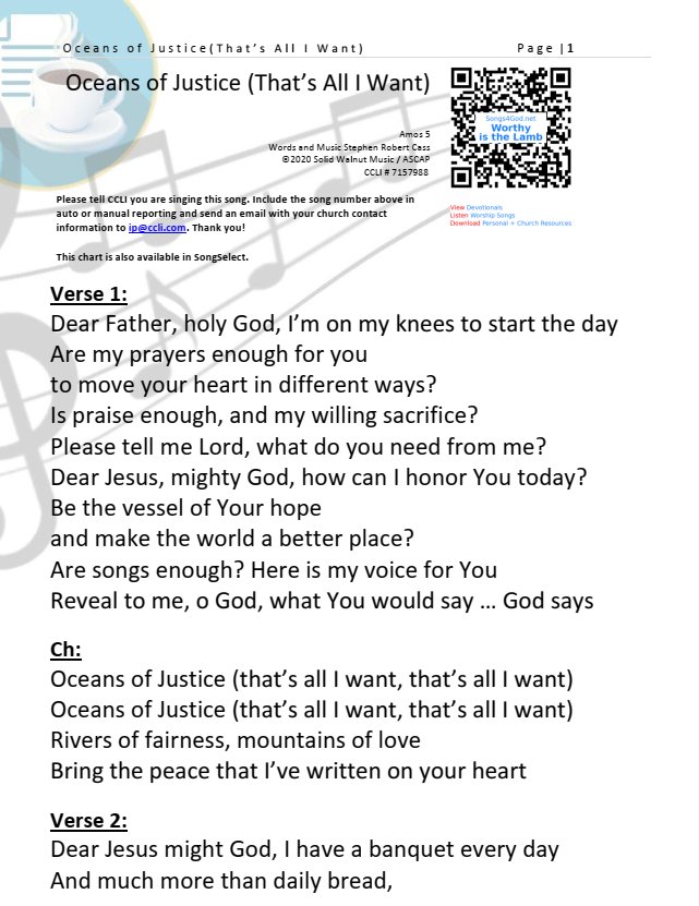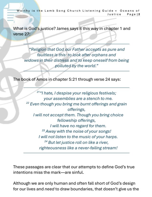 Amos 5 – 23 Away with the noise of your songs! I will not listen to the music of your harps. 24 But let justice roll on like a river, righteousness like a never-failing stream!