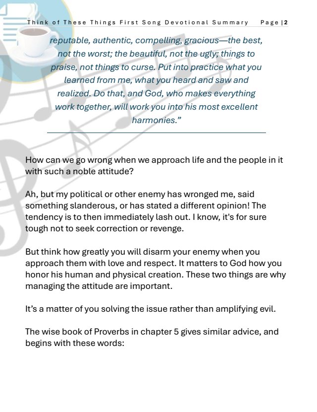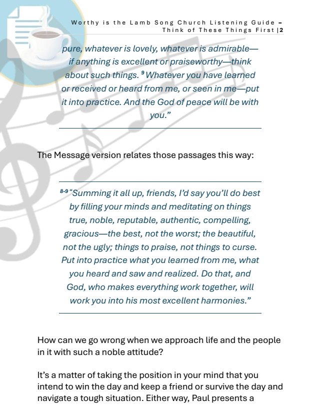 Philippians 4:8 – Finally, brothers and sisters, whatever is true, whatever is noble, whatever is right, whatever is pure, whatever is lovely, whatever is admirable—if anything is excellent or praiseworthy—think about such things.